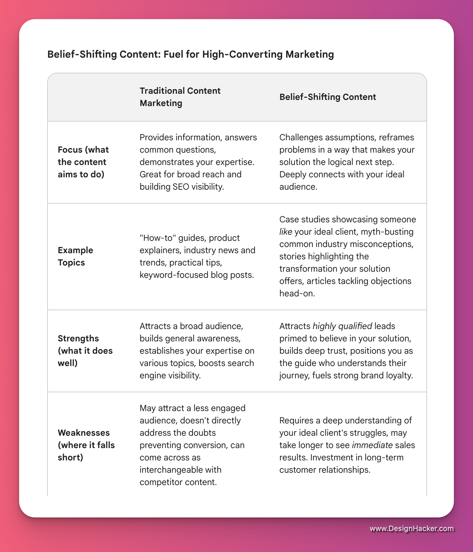 Here's the key: traditional content can inform and educate, but without addressing the hidden beliefs holding your ideal customer back, you're missing out on its true power. Let's break down the two main types of content and why one has the potential to transform your marketing results.