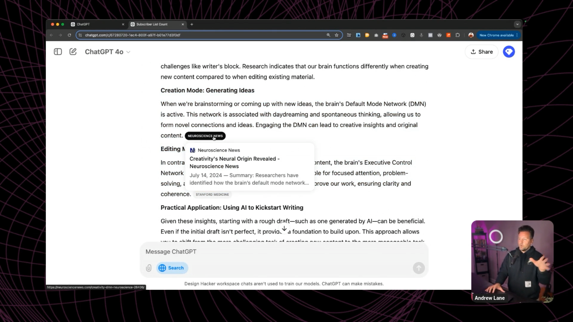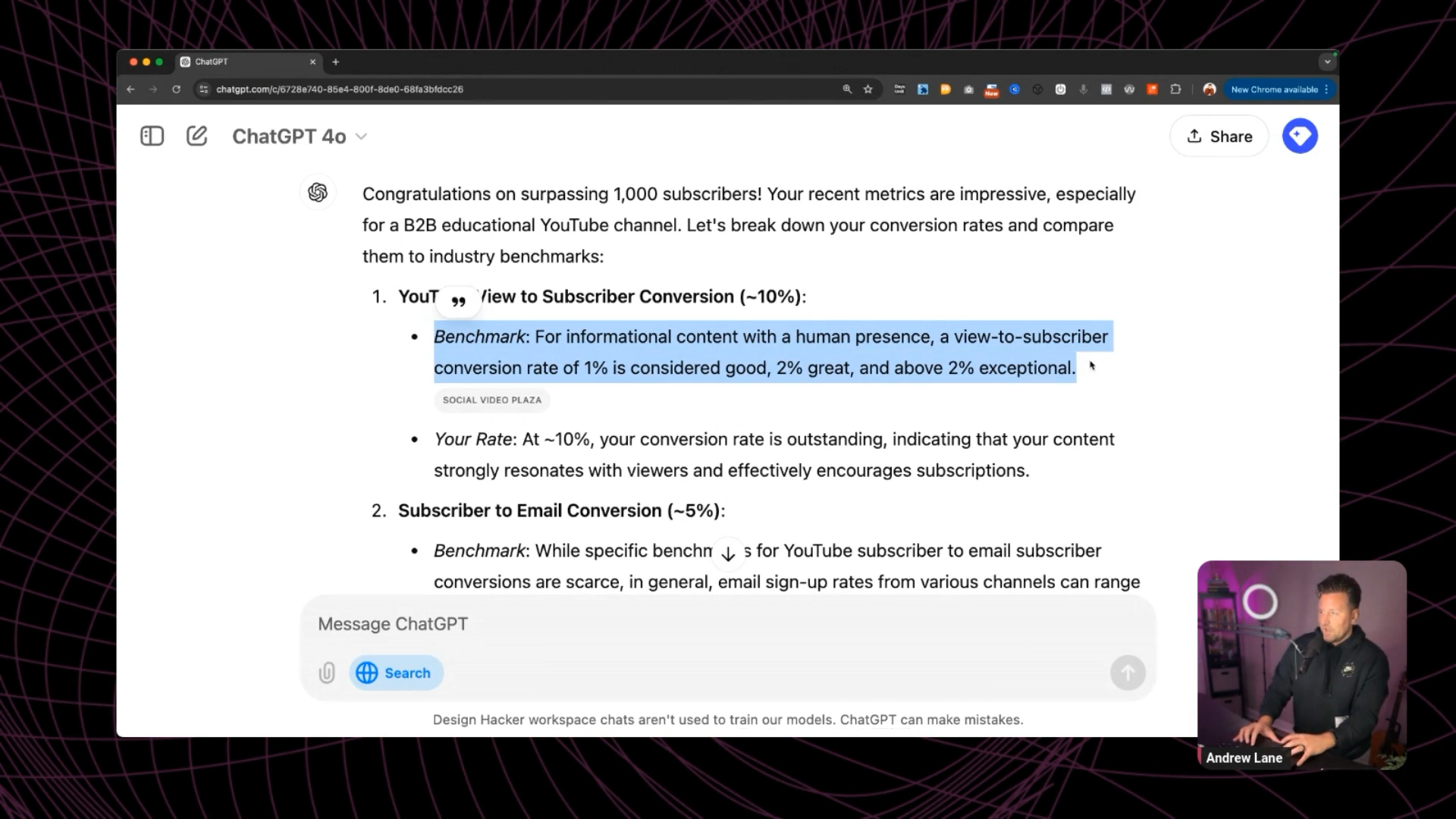 The result? ChatGPT search pulled data from reliable sources and provided much more specific, accurate insights about YouTube channel performance. Instead of generic statements, I got actual benchmarks backed by real data.