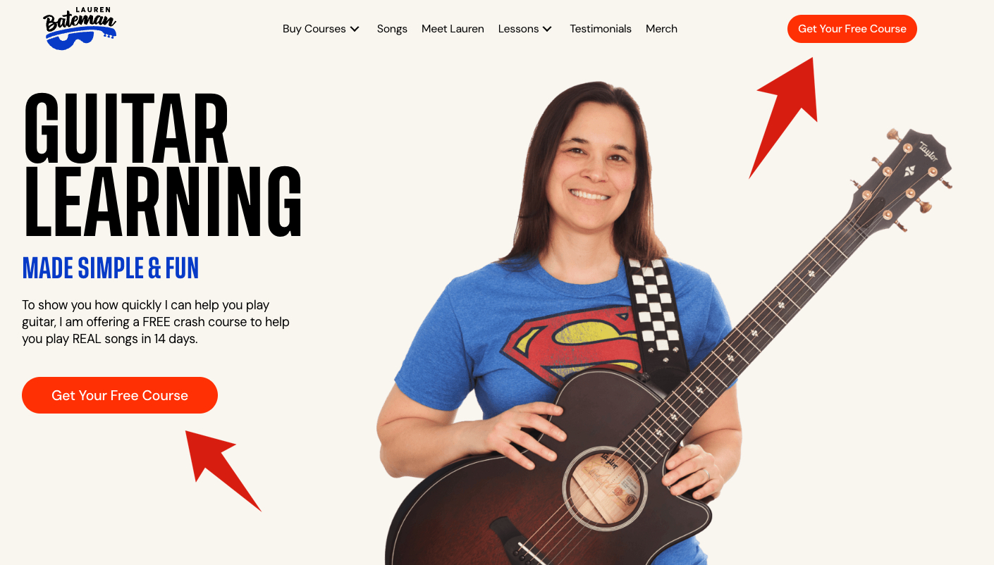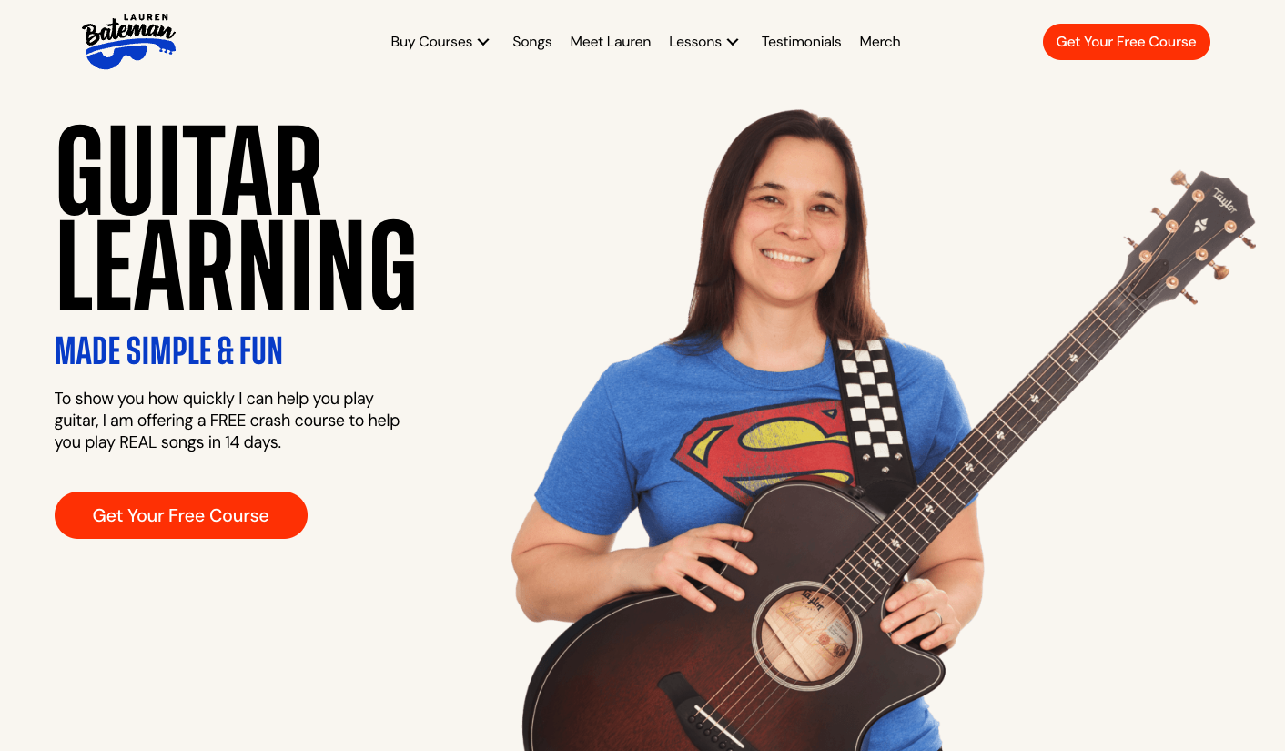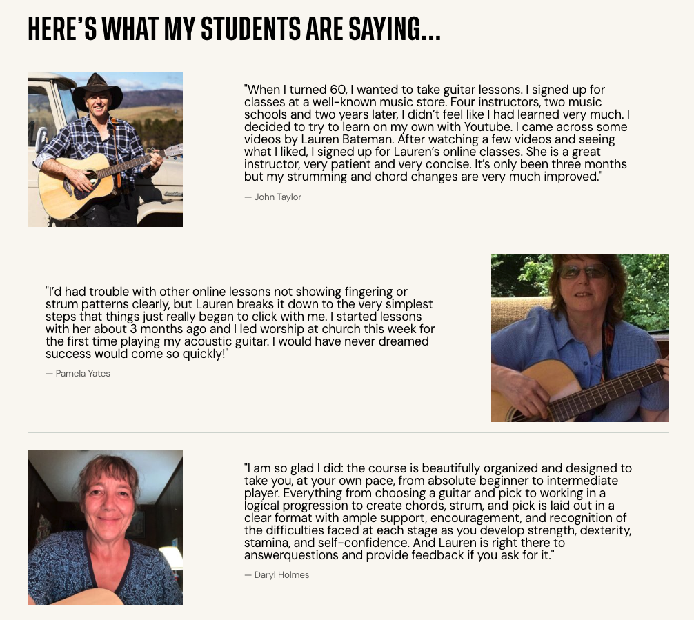 Problem-solution framing: Lauren addresses common challenges and false beliefs about learning guitar, then positions her courses as the solution.