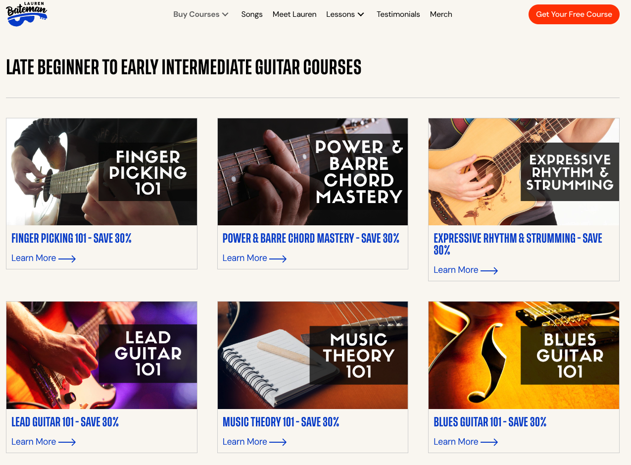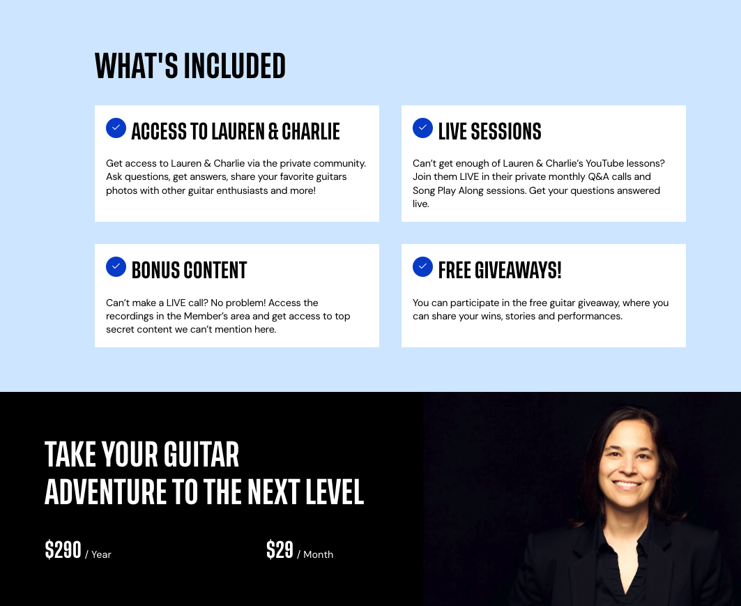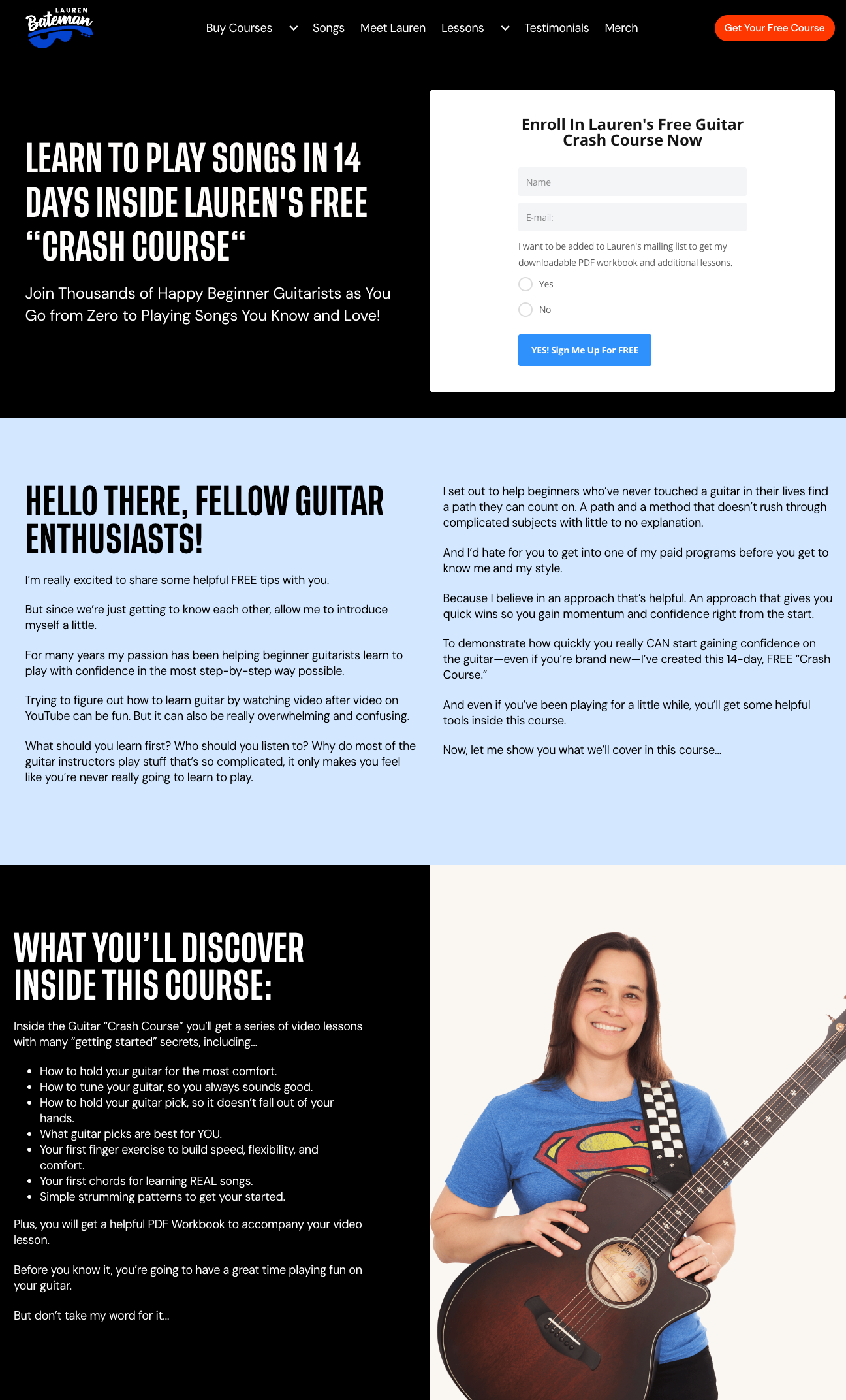 Problem-solution framing: Lauren addresses common challenges and false beliefs about learning guitar, then positions her courses as the solution.