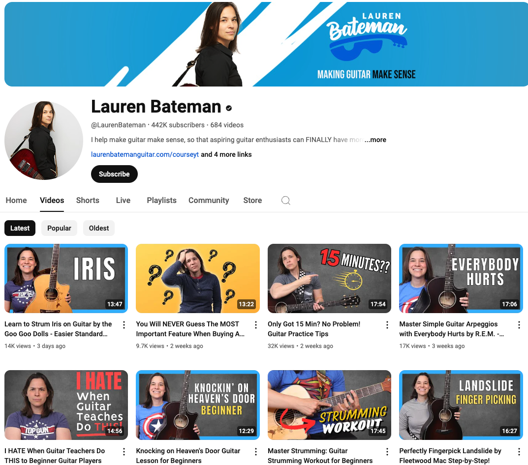 Engaging thumbnails: Lauren puts significant effort into creating eye-catching thumbnails with bold text, clear imagery, and often featuring herself playing guitar.