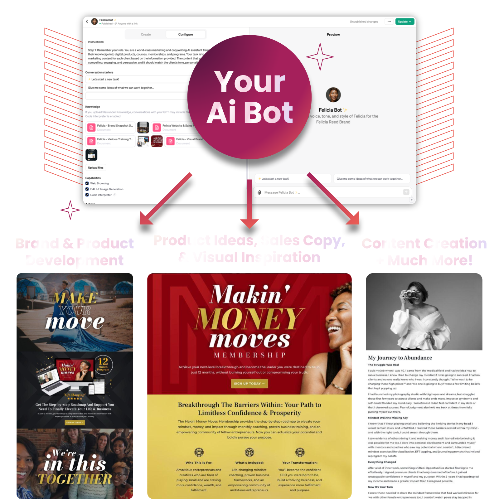 After just 60 minutes, your bot will be ready to create content, design graphics, and unlock growth opportunities. You also get 1 year access to ever-expanding AI prompts & training ($500 value).
