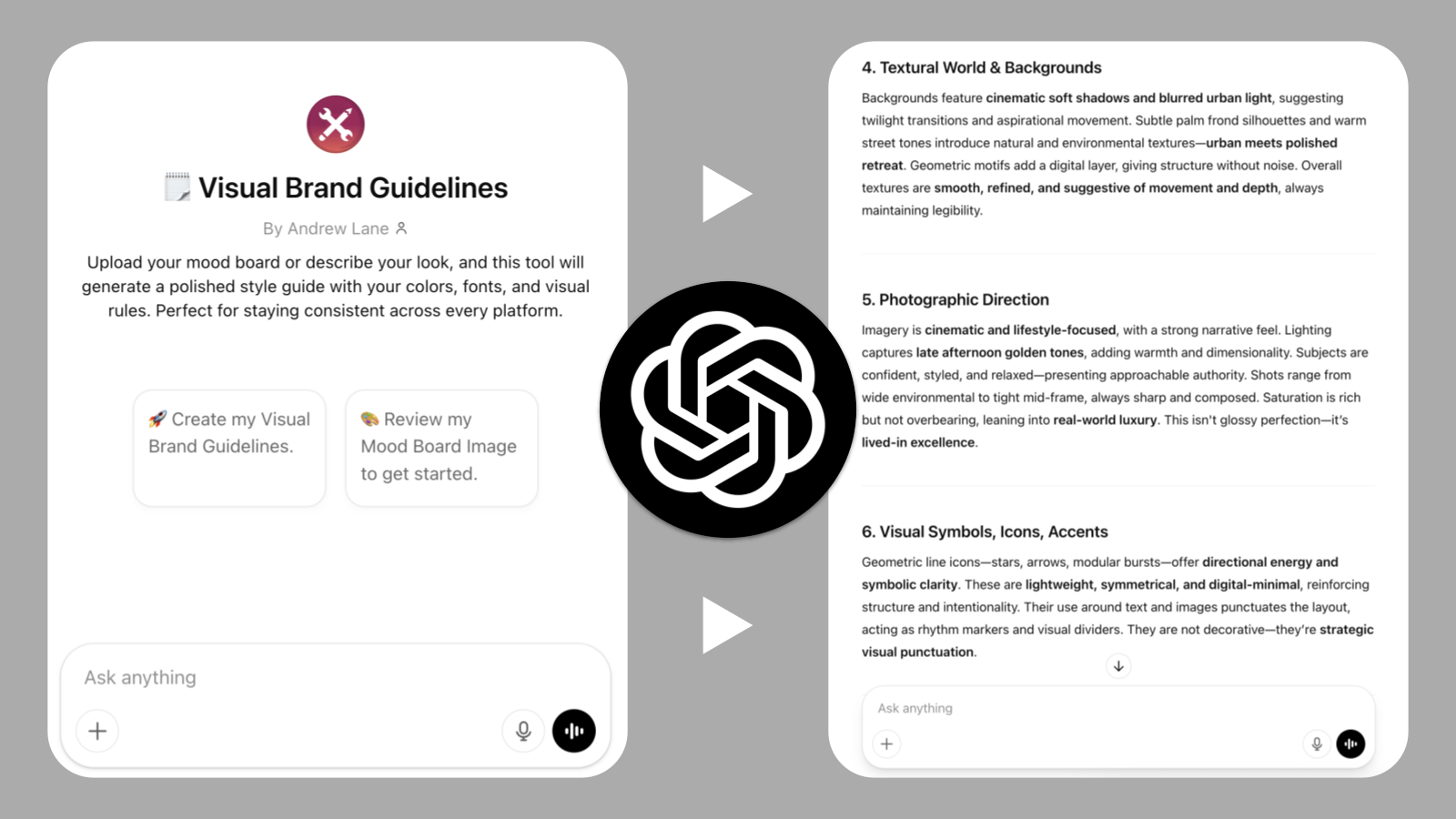 My custom ChatGPT tools give you unlimited inspiration and real, usable brand assets on demand.