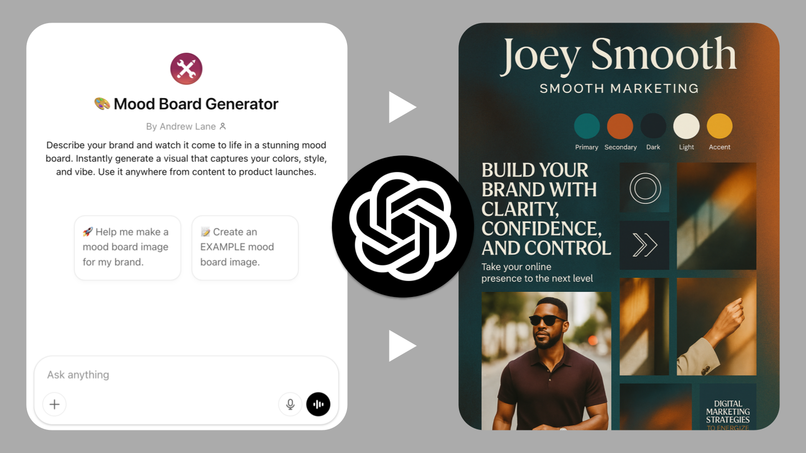 Drop in your Brand Vibe Report, notes, or any visual inspiration. This Custom GPT instantly generates a vertical mood board image that brings your brand to life. You’ll get fonts, colors, textures, photography style, and sample mockups... all designed to reflect your unique look and feel.