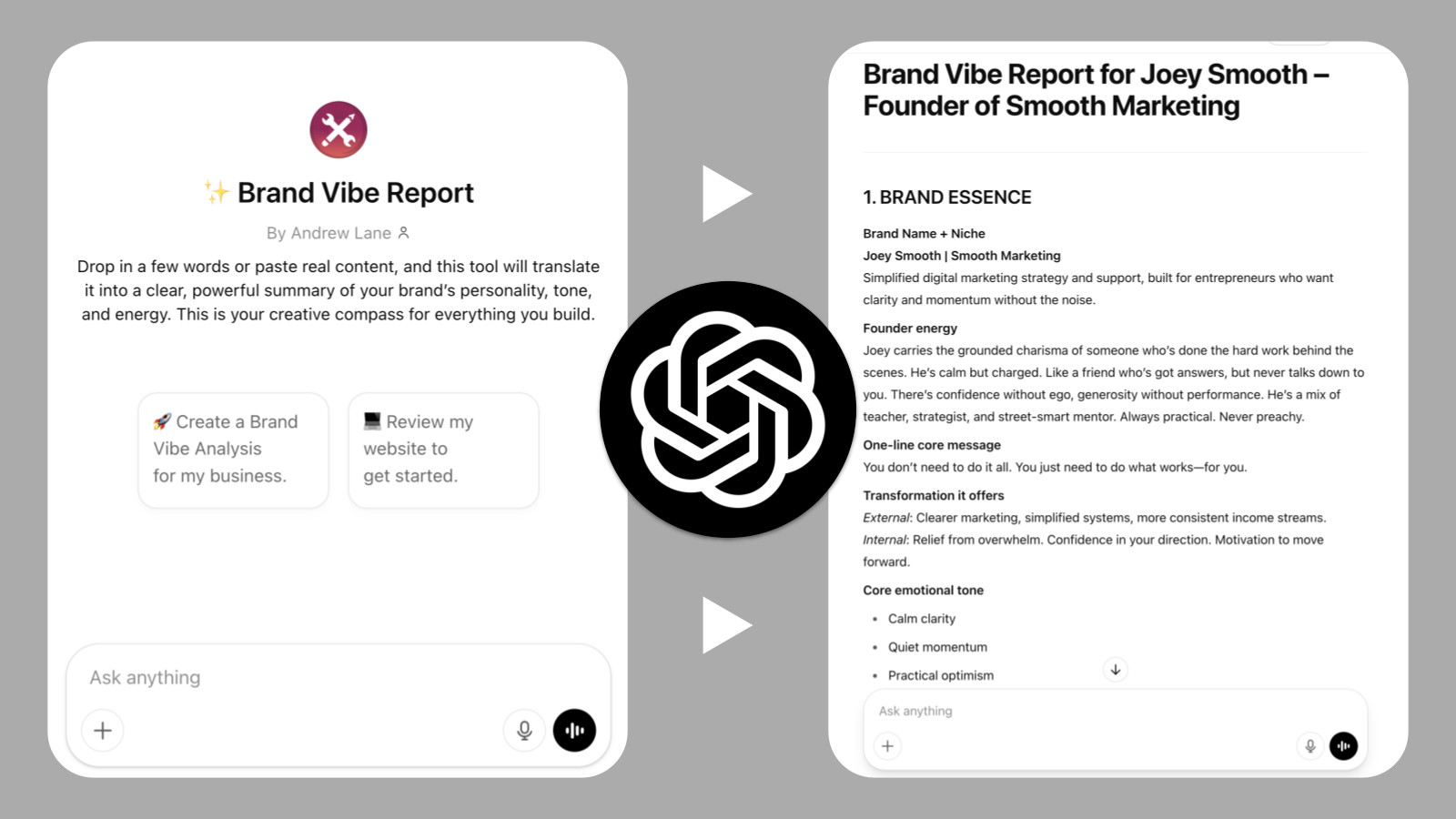 This Custom GPT breaks down the emotional tone, energy, audience, and deeper meaning behind your brand. You can type in one word, a sentence, or upload a full transcript or web page. ChatGPT will analyze it and return a clear, written overview of what your brand feels like and who it's for.