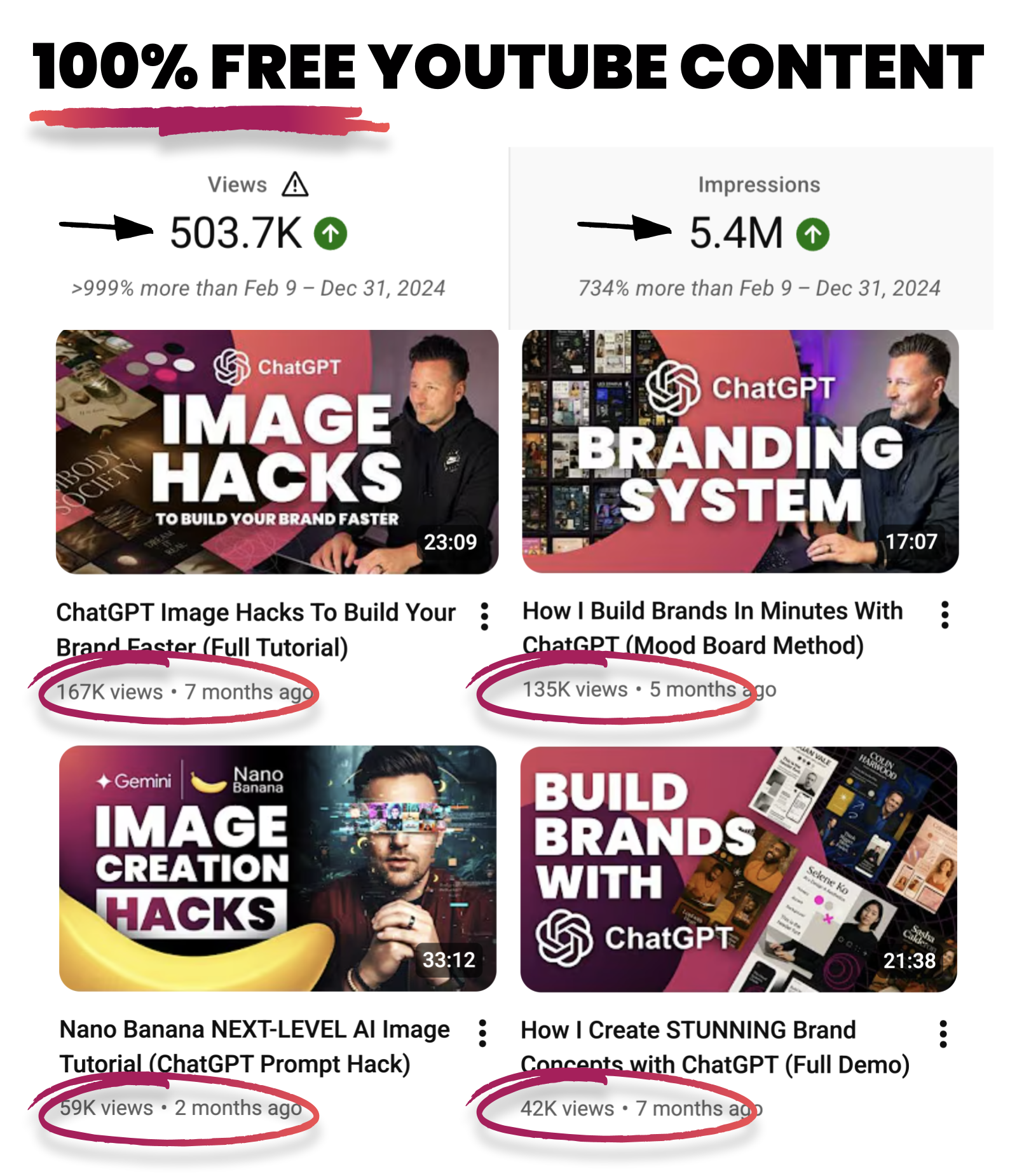 The Vault: You get Lifetime Access to the Brand Builder Club (100+ members). This includes all my courses, templates, and prompt libraries. You keep these assets and the community support forever.